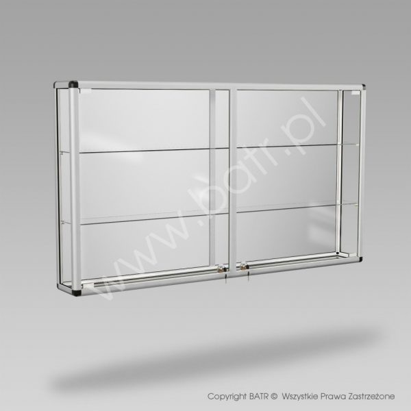 Gablota ta wyposażona jest w zamek patentowy, system montażowy do ściany oraz 2 półki z regulacją wysokości.