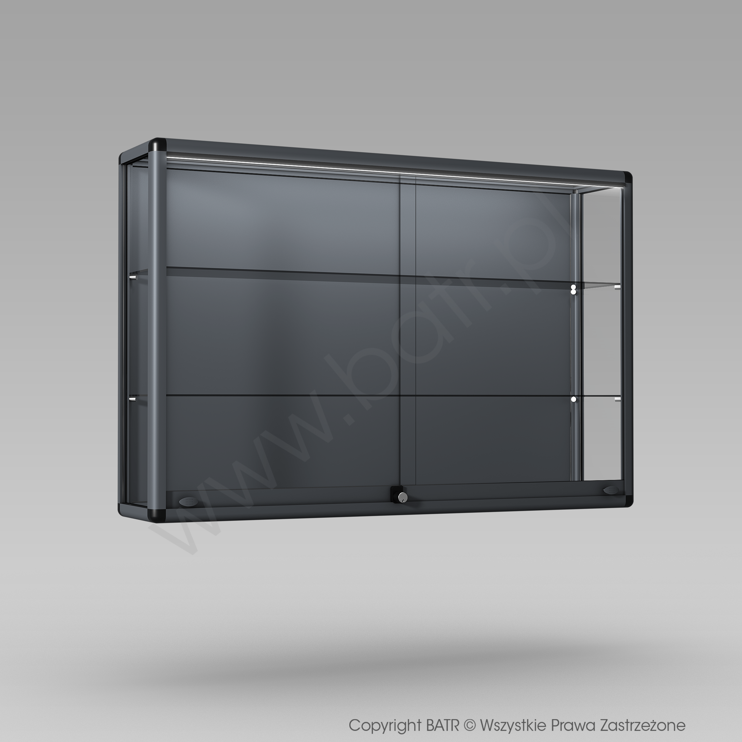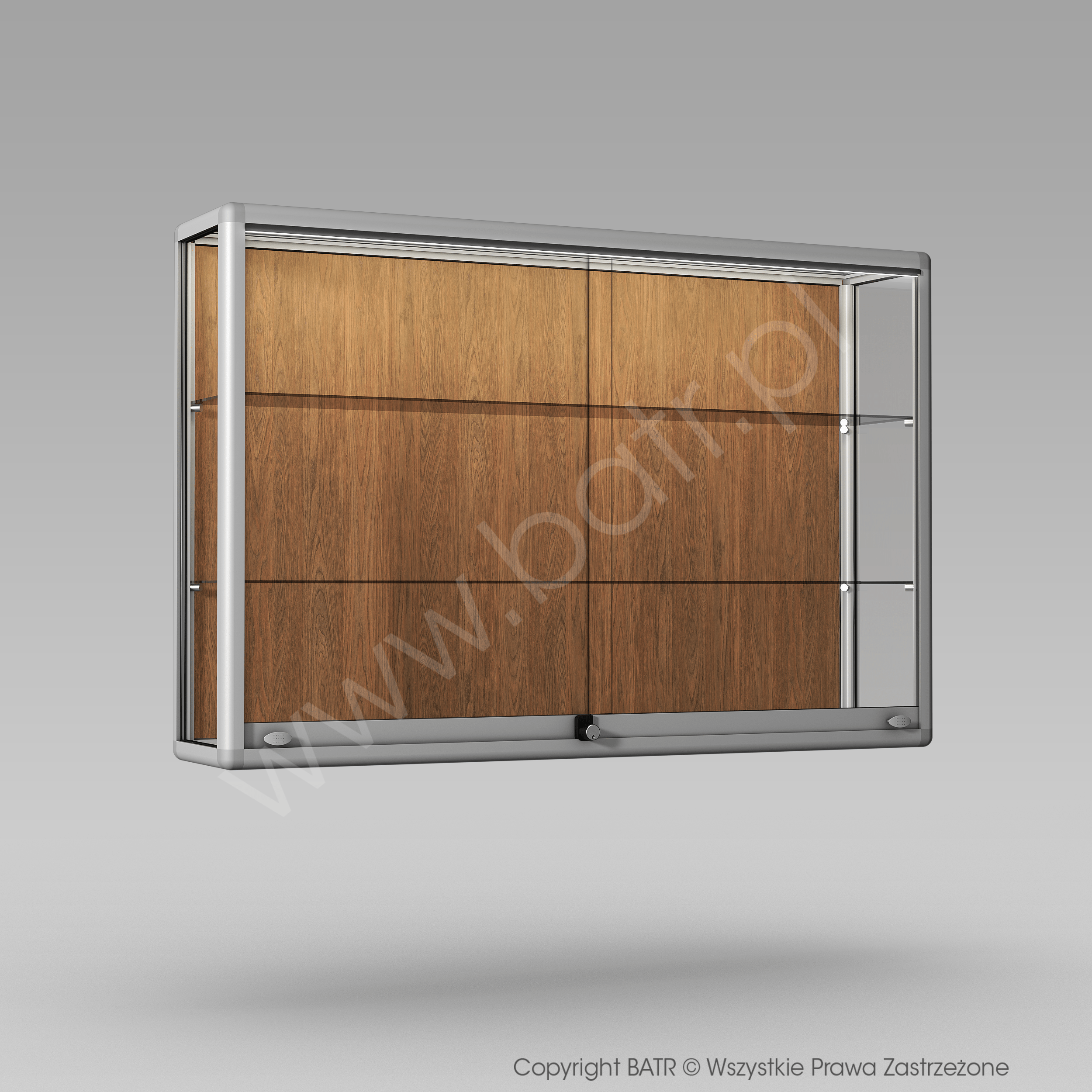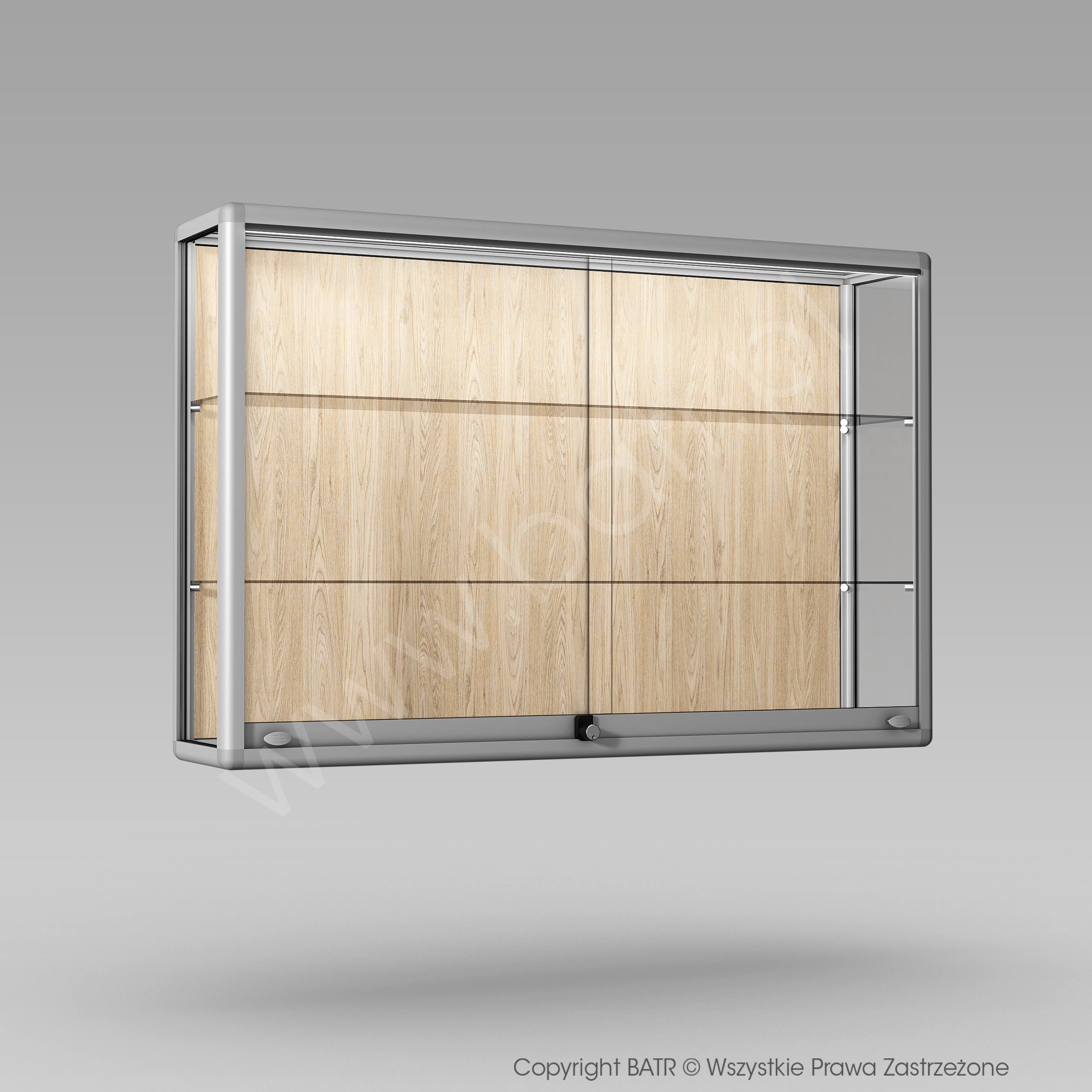 Gablota wisząca z drzwiami przesuwnymi wyposażona jest w zamek patentowy, system montażowy do ściany oraz 2 półki z regulacją wysokości.